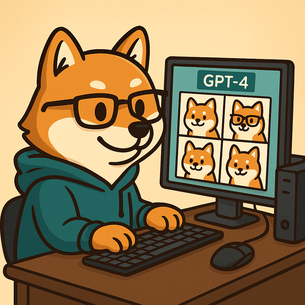 Create an image of a computer nerd Shiba, generating pictures of shibas using ChatGPT, cartoon style, size 1024x1024