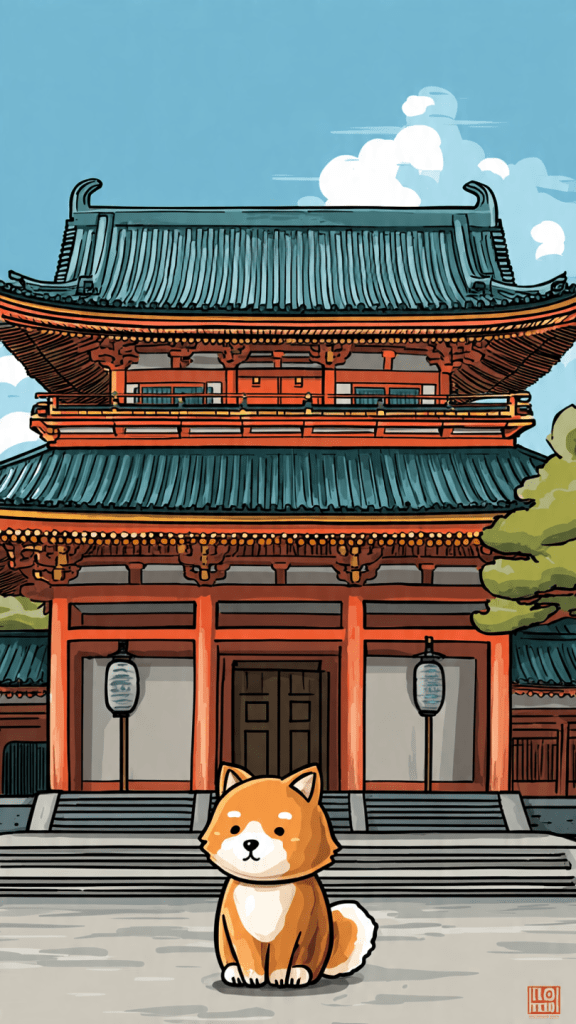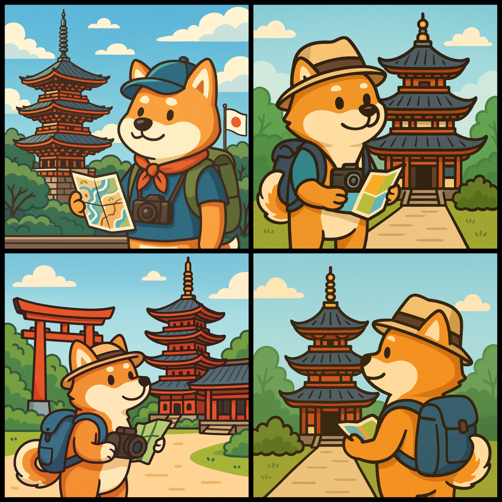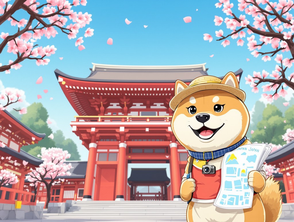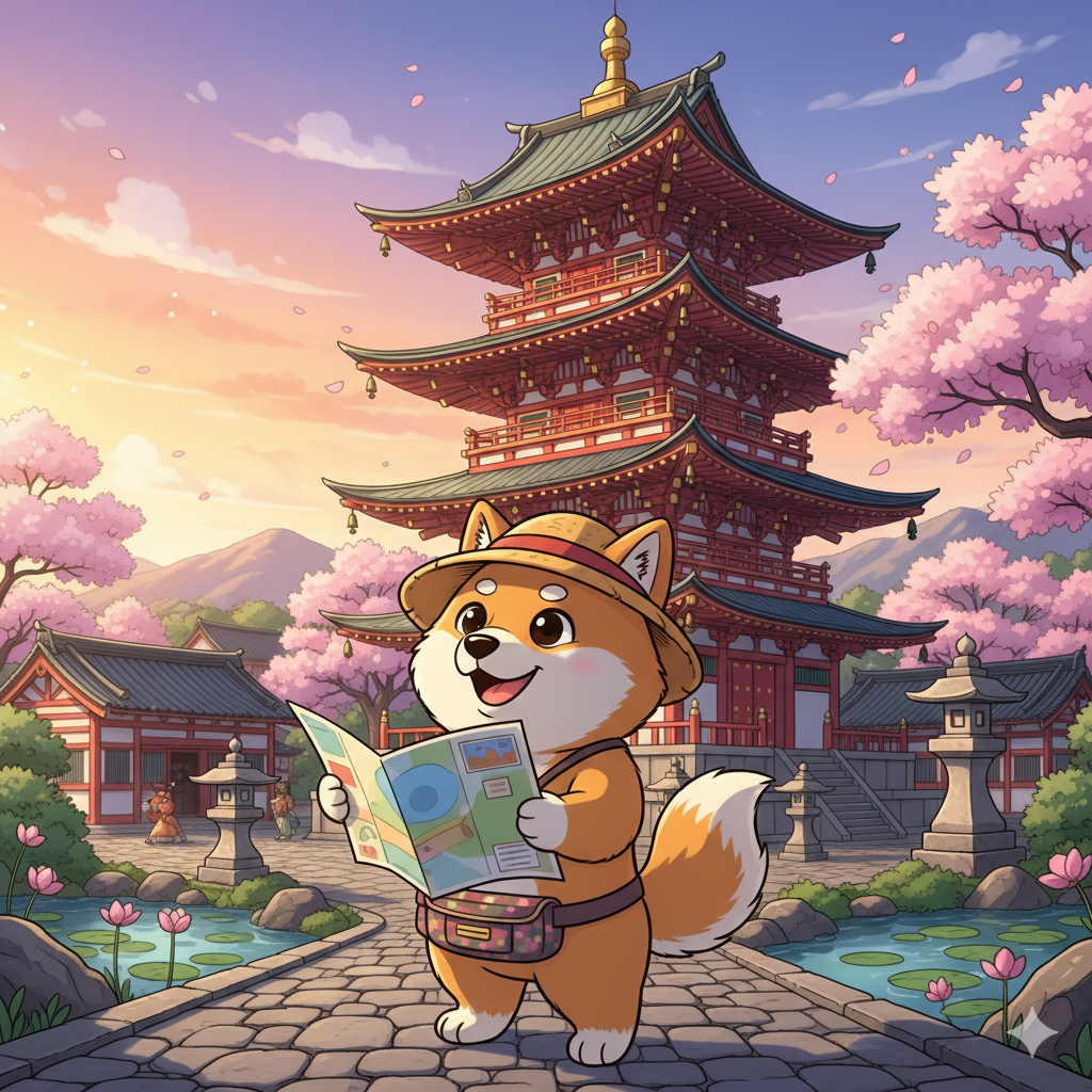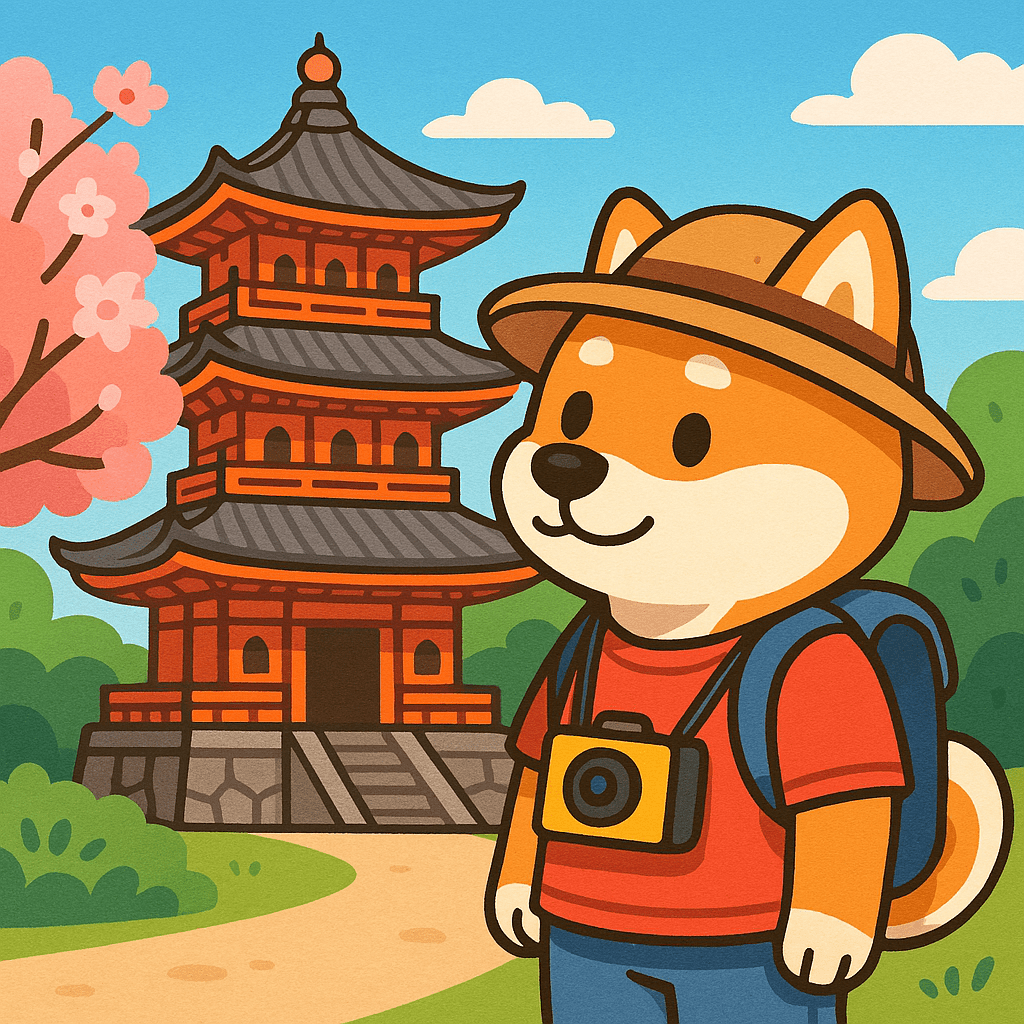 Create an image of a Shiba Inu as a tourist in Japan watching a japanese temple, cartoon style, size 1024x1024