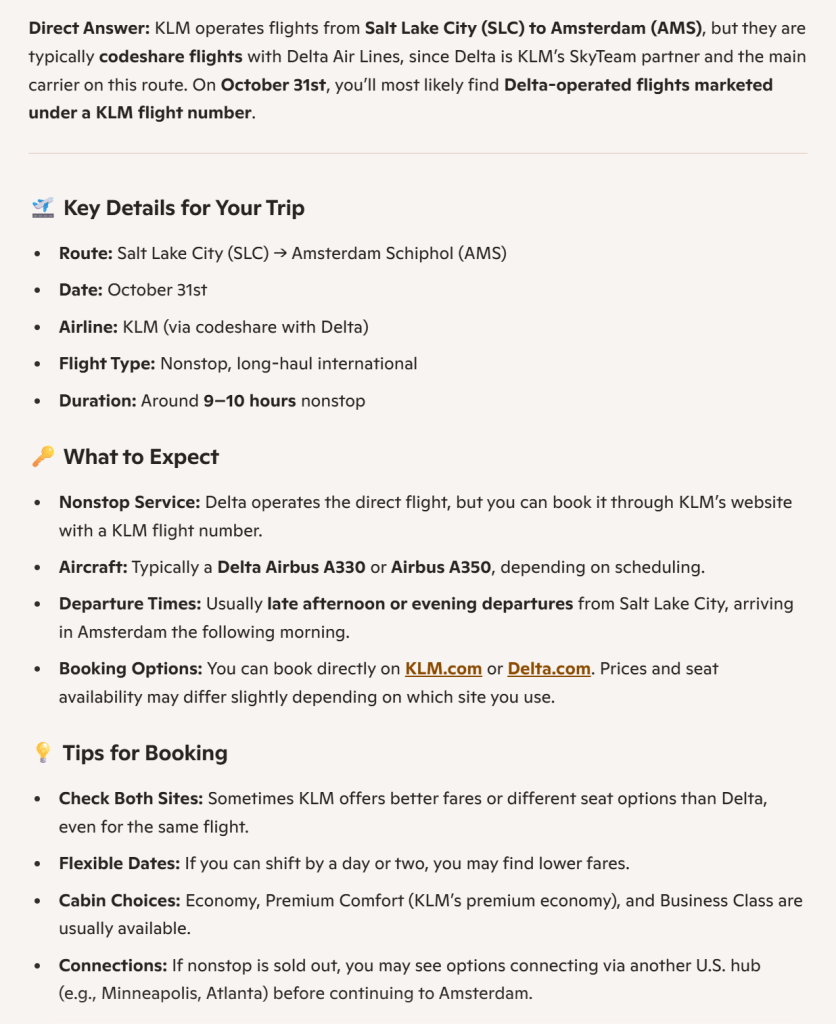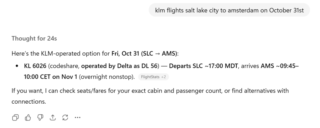My son is flying home from the US today, in-route to make it to Poznan and attend Directions EMEA 2025 starting on Tuesday. I knew he was flying from Salt Lake City to Amsterdam and wanted to see which plane and what time, to I went to edge (which now is powered by CoPilot) and asked:
